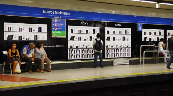 Las estaciones de Sol y Nuevos Ministerios del Metro Madrid se han convertido por unos días, gracias a JCDecaux, en un supermercado virtual donde los transeúntes pueden comprar productos de Sony Mobile desde sus móviles mediante códigos QR.