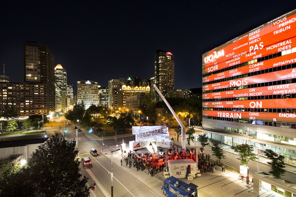 Esta experiencia multimedia e interactiva se estructura en tres zonas urbanas: la plaza, rodeada de contenedores animados con luz, proyección y efectos especiales donde cualquier persona puede hablar utilizando un megáfono; la fachada del edificio de la UQAM en la que se realizan proyecciones de efectos visuales generados por el reconocimiento de voz de los oradores, y la zona a pie de los altavoces, que cuenta con una instalación audiovisual especial para mostrar siete figuras clave que, con sus palabras, han dado forma al espacio público en Montreal.