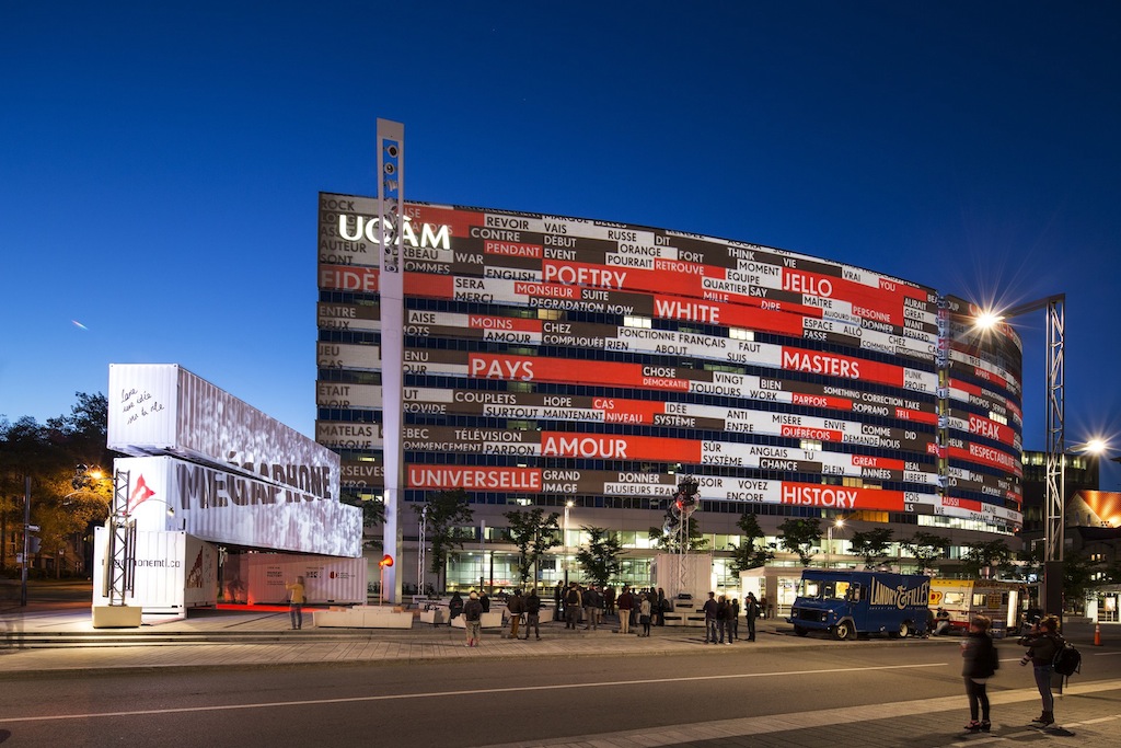 Cuando los participantes hablan, sus voces se transforman en tiempo real en imágenes proyectadas sobre la fachada de la Universidad de Quebec en Montreal (UQAM), dejando su ‘huella’ visual en el paisaje urbano.