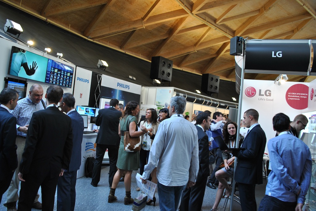 Para la celebración de la XII edición del Simposium de Ingran Micro, el mayorista ha contado con la colaboración de sus asociados, que en los casos de LG, con un videowall de 55″ 在配置2中×2 que reproducía imágenes en súper ultra alta resolución (4K) y un mupi de 47 pulgadas táctil; así como una pantalla de 飞利浦 de 55″, gestionados con player de 比布卢 和的 研华, recibían a los profesionales mostrando la información del evento, las ponencias y talleres en el registro de entrada.