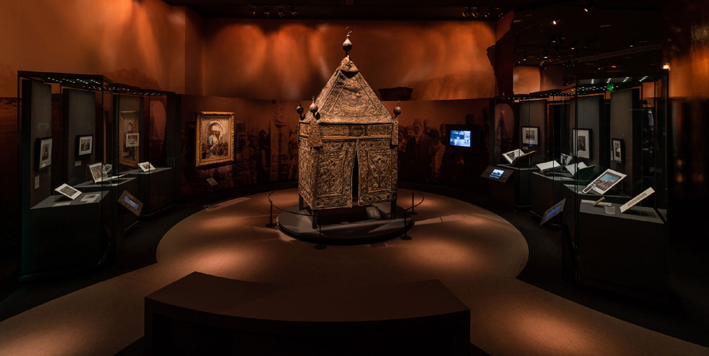 Estos objetos de arte se engloban en espacios circulares que simbolizan las etapas y estaciones que cruzan los peregrinos antes de postrarse ante la Ka´aba. La luz escenográfica, tan característica en los proyectos de Acciona Producciones y Diseño, unifica un ambiente casi mágico, donde los objetos artísticos se convierten en tesoros que transmiten sus orígenes y significados.