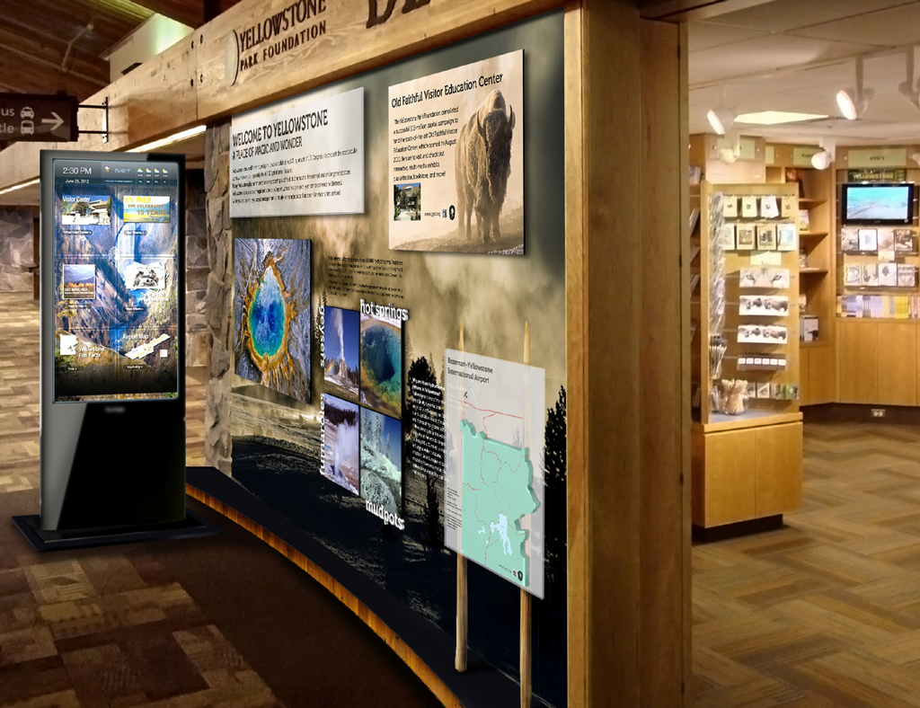 数字标牌在黄石国家公园随处可见. 大尺寸屏幕, Savant 的 LCD 面板和两个交互式信息亭是其 Destination Yellowstone 展览中使用的主要工具.