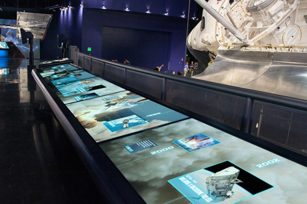 还安装了屏幕,让特色节目栩栩如生, 班车运输系统时间表上还安装了更多触摸屏. 该装置由六个 MultiTaction Cell 组成 55 几英寸的倾斜桌子上提供了有关美国宇航局发射的航天飞机计划的好奇事实和令人惊讶的图形. 提供关键任务日期和事实, 以及航天飞机机组人员的数据, 探险, 有效载荷, 太空行走, 实验, 发射和着陆….