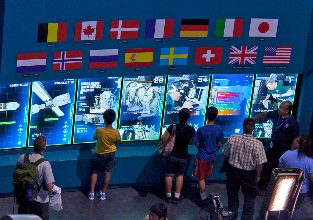 讲述国际空间站的故事, 这个多屏幕可以回顾过去并提供今天的实时视图. 包括交互式 3D 模型并展示空间站组装过程, 有趣的动画描绘了国际空间站机组人员一天的生活. 游客还可以享受科学实验和探险的乐趣, 接收来自太空的直播,甚至只需输入您的邮政编码即可知道空间站何时经过您的家.