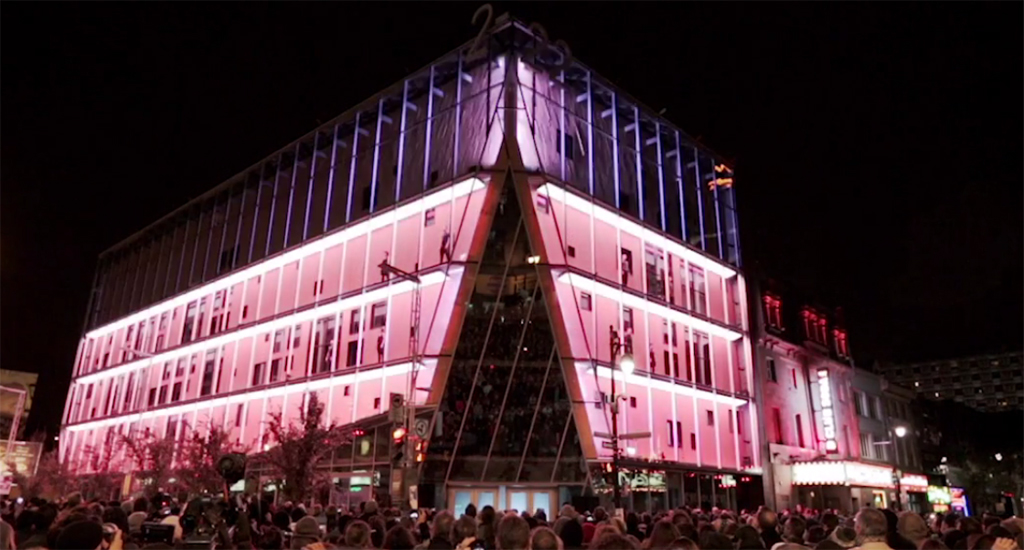 Moment Factory ya participó en otra instalación que se realizó en este edificio en 2012. Al igual que con el proyecto actual, el diseño creado el pasado año tenía como objetivo atraer la atención de los transeúntes y, 为了它, se implantó un gran “muralla” interactiva integrada por LED. La interfaz de la pantalla está equipada con una serie de sensores que transforman el inmueble en una creación luminosa, añadiendo una nueva dimensión al barrio.