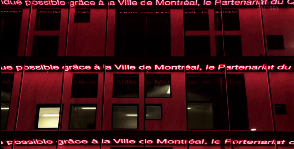 Moment Factory ha trasformado la fachada del edificio con su espectáculo de luz, integrado por paneles de LED convencionales, que recorren los pasillo y, 除了, ha creado un gigantesco 2-22 que pretende contar historias del barrio y hacer revivir emblemáticas ubicaciones mediante el uso creativo de la luz para rendir homenaje a la evolución de este espacio mítico del paisaje urbano de Montreal.