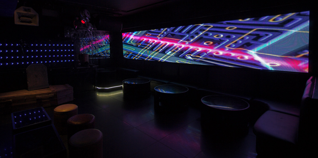 En este local, Emto también ha optado por un modelo outdoor por su robusto acabado y durabilidad. Estas pantallas son utilizadas para efectos strobed, como ayuda para crear la atmósfera que se desea. Para su control, Emto ha suministrando otro sistema GrandVJ ArKaos.