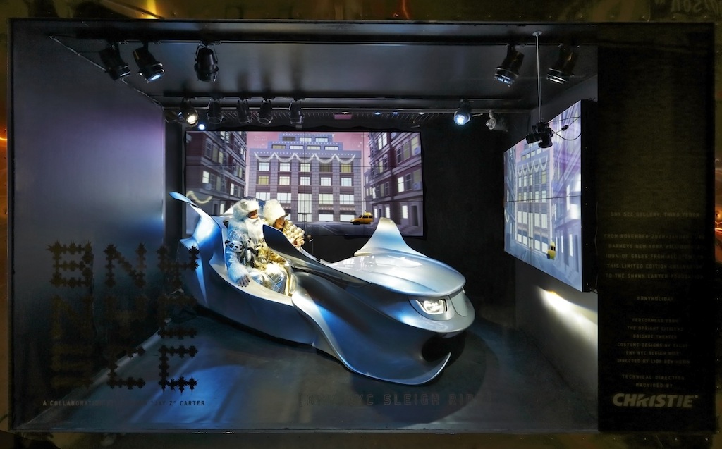 以全新方式演绎圣诞经典, 创建了一个展示“BNY NYC 雪橇之旅”的展示柜, 即兴演员阵容不断变化, 来自正直公民旅剧团, 装扮成现代圣诞老人带着孩子们乘坐“虚拟雪橇”穿过抽象的纽约市. 感谢参与式屏幕, 居住者感觉就像在空中, 飞经纽约. 科视Christie Weather 在这次独特的雪橇之旅中,窗外的所有平板都显示儿童和圣诞老人的图像.
