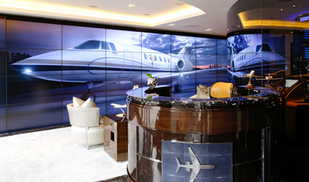 该设施为客户提供了巨大的吸引力,例如空客公司飞机机舱的真人大小复制品。 (ACJ 319) 和视频墙 4×8 组成 32 监视器 日本电气公司 提供有关待售飞机的信息.