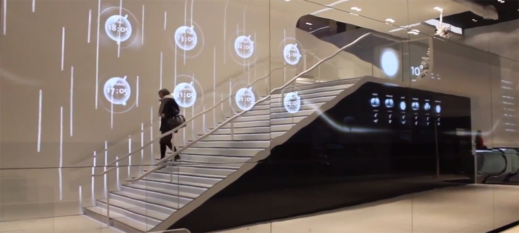 Este original mosaico está integrado por 40 pantallas LCD cuyas divisiones son invisibles a los ojos por lo que parece que todas ellas forman un solo elemento. Los contenidos son mostrados de forma uniforme, en una sola escena de 19200 x 1080 像素, como si de una onda se tratara. Decenas de flujos de información, casi holográficas, se actualiza cada minuto web y se procesan en tiempo real con un diseño de gráficos.