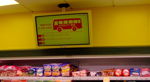 La distribución de las pantallas de gran formato en la cadena Hiperdino se ha diseñado en consonancia con el flujo circulatorio del público en el establecimiento y buscando siempre la máxima visibilidad, lo que permite que tanto clientes como trabajadores formen parte activa de este proyecto.