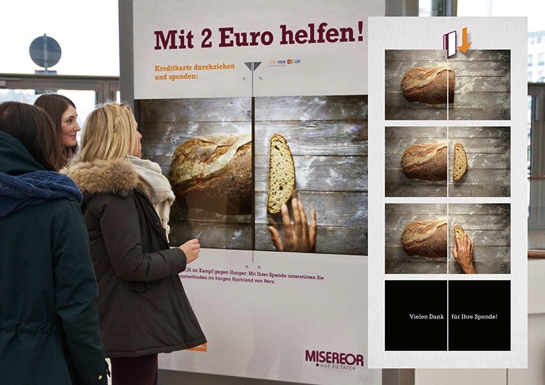 La idea de aunar la tecnología de digital signage con la de estimular la voluntad de las personas para realizar donaciones parte de la agencia alemana Kollam Rebbe. Esta acción creativa y solidaria de ambient marketing tiene como objeto captar recursos provenientes del 40% de la población que realiza pagos a través de las tarjetas de crédito Mastercard.
