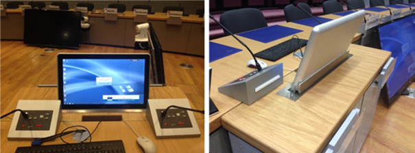 La Comisión Europea ha confiado en las pantallas DynamicX2 de Arthur Holm para sus salas de reunión. Unos ergonómicos equipos de 22” de alta definición que se controlan en remoto y permiten giros, 垂直和水平, 从 到 20 度.