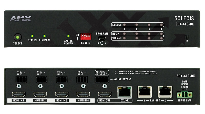 Los selectores digitales Solecis de AMX también han sido diseñados para integrarse en los sistemas más grandes y complejos. Todos los modelos incluyen dos salidas, una HDMI para una pantalla local, y otra de transportes a larga distancia AMX DXLink para una pantalla remota.
