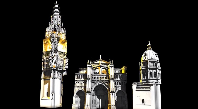 “我们必须建造两座面对面的塔楼,”泰斯顿解释道。- 覆盖并“染色”大教堂外墙尽可能大的表面, 过程非常复杂和费力, 因为有必要从市政广场的两个不同点进行投影,以避免产生遮蔽图像的阴影,并保持这一创作的共同线索,以便公众认识到所展示的历史。”.