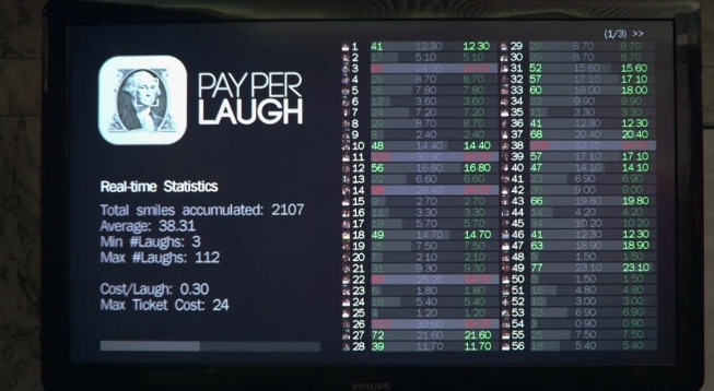 El resultado de la experiencia fue una media de 49 carcajadas por espectador, que habría supuesto un coste de 14,7 euros de entrada, si el límite no hubiera sido de 8 欧元. FaceTracker detectó y reconoció las expresiones faciales vinculadas, 值此之际, a la risa y al contador de sonrisas.