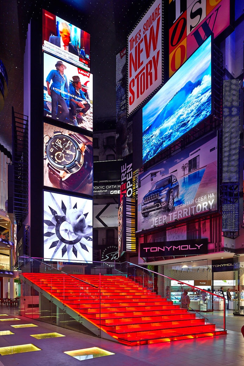 El centro comercial Vegas Crocus City, ubicado en Moscú, ha realizado todo un despliegue audiovisual en HD para recrear la neoyorquina Times Square con una fachada mediática de pantallas LED Color Kinetics de alta definición de Philips, que ha supuesto el mayor proyecto de iluminación de este tipo realizado en Rusia.