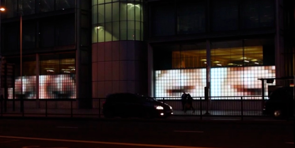 Esta artística obra digital, denominada ‘Eye contact’ y realizada por el artista Peter Hudson, recientemente graduado en la Camberwell College of Arts, ha ganado el premio del centro de investigación Wellcome Trust, que la ha instalado en su fachada. Como han señalado, “la propuesta de Peter Hubson con ‘Eye contact’ responde a nuestra creciente dependencia de las pantallas digitales para mediar contenido emocional y esta inspirada en su experiencia personal y en la motivación para involucrarse con la cultura contemporánea”.