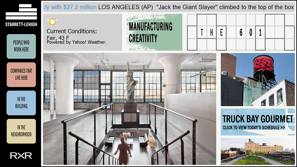 ITS ha trabajado con RXR Realty para instalar directorios con pantalla táctil en sus propiedades de la ciudad de Nueva York y Nueva Jersey. La relación con el edificio de Starrett-Lehigh comenzó en 2009, momento en el que se plantearon la sustitución de los sistemas de señalización digital existente del edificio. El edificio de Starrett-Lehigh se encuentra en Manhattan Chelsea West y es conocido por su gran creatividad. Con inquilinos dedicados a la industria de la moda y el diseño de alto standing se ofrecen grandes expectativas para una experiencia de comunicación digital sofisticada en todo el edificio.