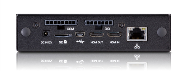 También dispone de un conjunto de funciones de E/S en los paneles frontal y posterior de su chasis sin ventilador. Por delante presenta tres puertos USB 2.0 y conectores para entrada/salida de audio, mientras que en la parte posterior incluye dos puertos Mini HDMI para entrada y salida HDMI, un puerto de E/S digital que admite GPIO de 4 位, un puerto COM compatible con RS232/485, 千兆以太网港, una ranura para tarjetas micro SD, 一个迷你 USB 端口 2.0 y una entrada de alimentación de 12 V.
