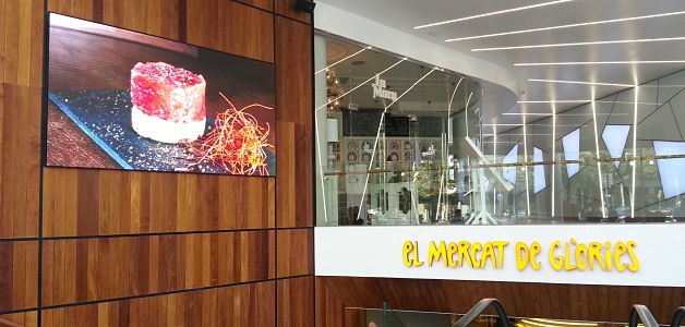 Inspirado en un mercado tradicional, el nuevo espacio dedicado a la alimentación y restauración del centro comercial Les Glòries de Barcelona cuenta con dos pantallas Led de gran formato fabricadas por Led&去.
