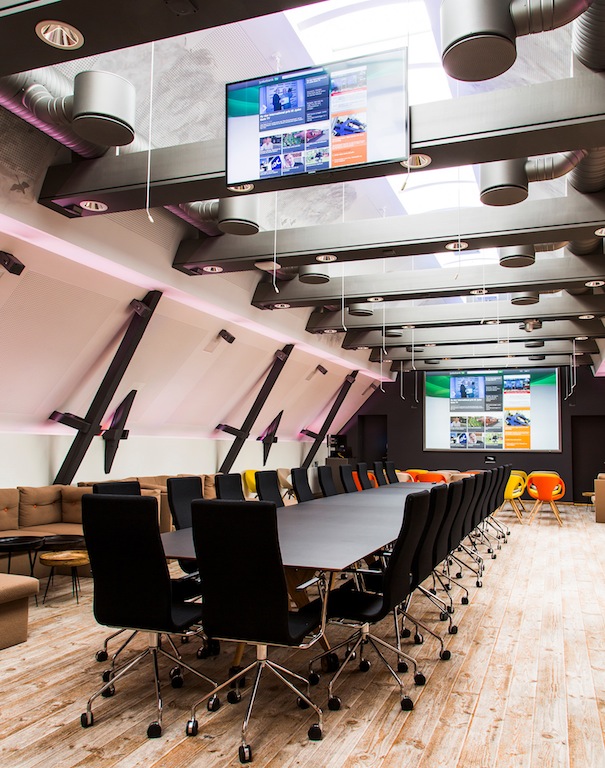 Así lo explica Steen Mertz, director TIC de Jyske Bank: “sabíamos que la habitación en sí era ya un desafío, ya que es larga y estrecha, con un techo bajo acristalado y mucha luz natural procedente de esta gran ventana y de las claraboyas, lo que suponía un reto añadido para la instalación de un sistema visual de alta calidad, fácil de utilizar y que armonizara con el diseño interior de la sala, tal y como queríamos”.