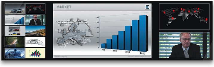 La configuración de Vision Presenter presentada en ISE mostrará una solución de proyección de triple pantalla con proyectores WUXGA y WXGA y contenido de vídeo procedente de múltiples entradas de fuente, también mostraremos cómo podemos compartir la experiencia visual con ubicaciones remotas.