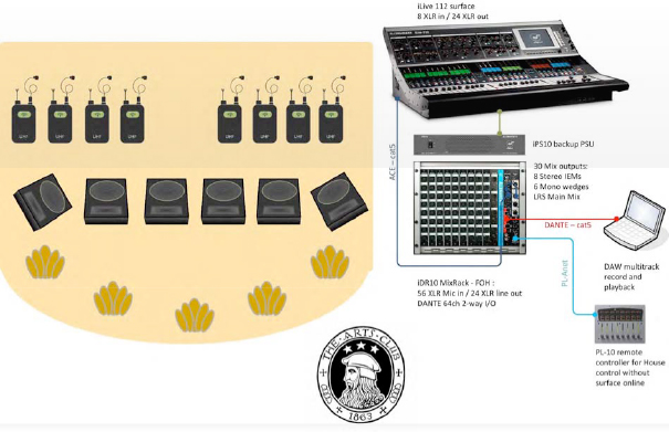 Debido a lo limitado del espacio, la superficie iLive se ha colocado a la izquierda del escenario, y proporciona seis mezclas para monitores de escenario y ocho mezclas estéreo para monitoraje intra aural.
