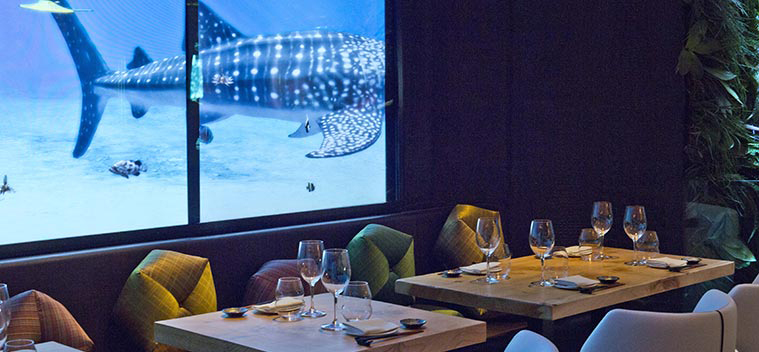 顾客将踏上感官美食之旅. 所有这一切都围绕着一个试图捕捉日本文化但又带有一定现代主义风格的环境。, 正如其中一堵墙上方的视频墙所展示的那样,其目的是创造一个大型水族馆的效果.