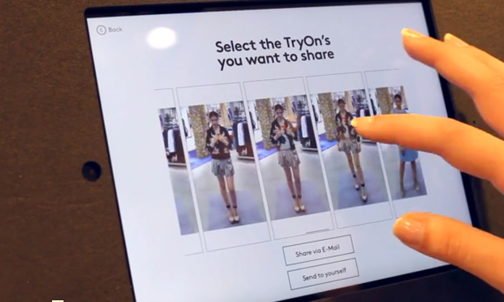 El funcionamiento de esta pantalla inteligente de señalización digital es muy sencilla. El cliente se sitúa frente al espejo con la ropa que se está probando y el espejo visualiza como quedaría en otros colores. El espejo va tomando imágenes para realizar la comparación y proporciona vistas en 360 grados para mostrar todos los ángulos. 除了, es posible dividir la pantalla y poder así ver imágenes anteriores. Estas instantáneas se pueden compartir con los amigos a través de Facebook o enviar vía email.