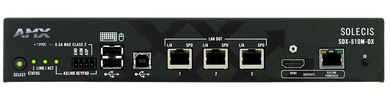 AMX ha incorporado un nuevo miembro a su familia selectores digitales AV, Solecis SDX. El digital switcher Solecis SDX 5×1 (SDX-510M-DX) permite que los participantes en una reunión o integrantes de un aula puedan, directamente desde la mesa, seleccionar cuál entre los múltiples portátiles de los asistentes u otras fuentes AV, se muestre en una pantalla de manera sencilla y rápida.