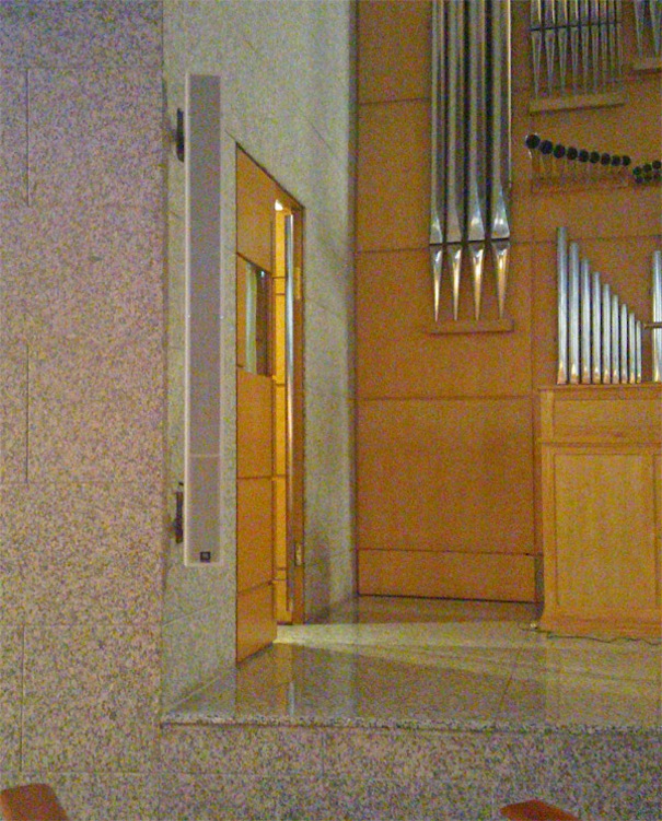 El patrón polar cardioide de estos micrófonos ayuda a reducir desde el principio la captación de sonido reflejado, contribuyendo en origen a una inteligibilidad óptima de la palabra. Las señales de estos cuatro sistemas (junto con las de otros dos micrófonos de sobremesa que ya había en el altar de la iglesia) entran a un mezclador digital automático SCM820 de este mismo fabricante.