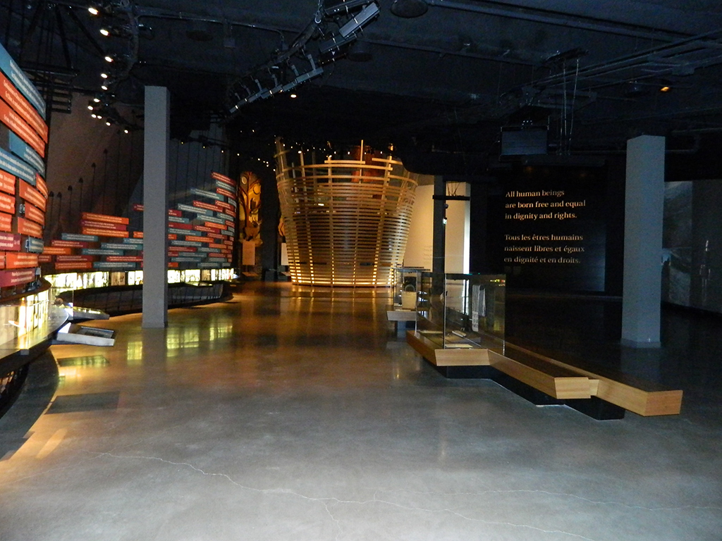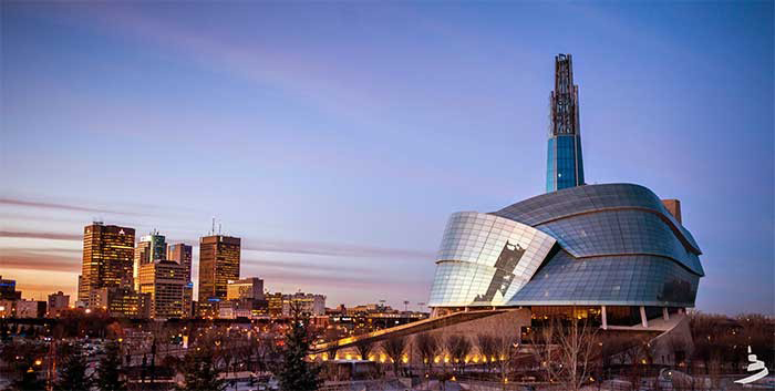 El nuevo Museo canadiense para los Derechos Humanos (Canadian Museum for Human Rights) de Winnipeg (Manitoba) presenta un innovador diseño arquitectónico, realizado por el estadounidense Antoine Predock, en el que se ha utilizado piedra acero, vidrio y hormigón para su construcción y al que se ha dotado de rampas de alabastro y puentes revestidos de piedra, entrecruzando un atrio de 51,8 地铁.