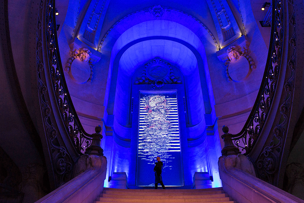 这是一个沉浸式装置, 灵感源自高提耶 (Gaultier) 的理念和时装秀的理念, 改变艺术的阶梯, 位于博物馆一楼和二楼之间, 在“缪斯的阶梯”上.