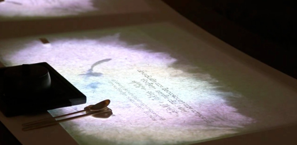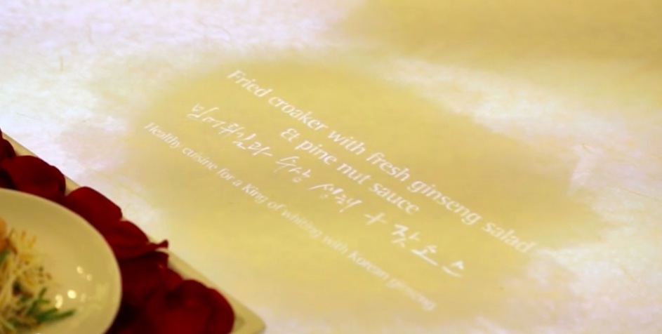 Para que los monitores no fueran fácilmente visibles en la gran mesa redonda en la que tenía lugar la comida, la agencia cubrió toda la superficie utilizando el papel tradicional coreano, denominado Hanji, hecho a mano con la corteza interior de papel de morera (un árbol originario de la zona), que simulaba una llanura ininterrumpida en la mesa.