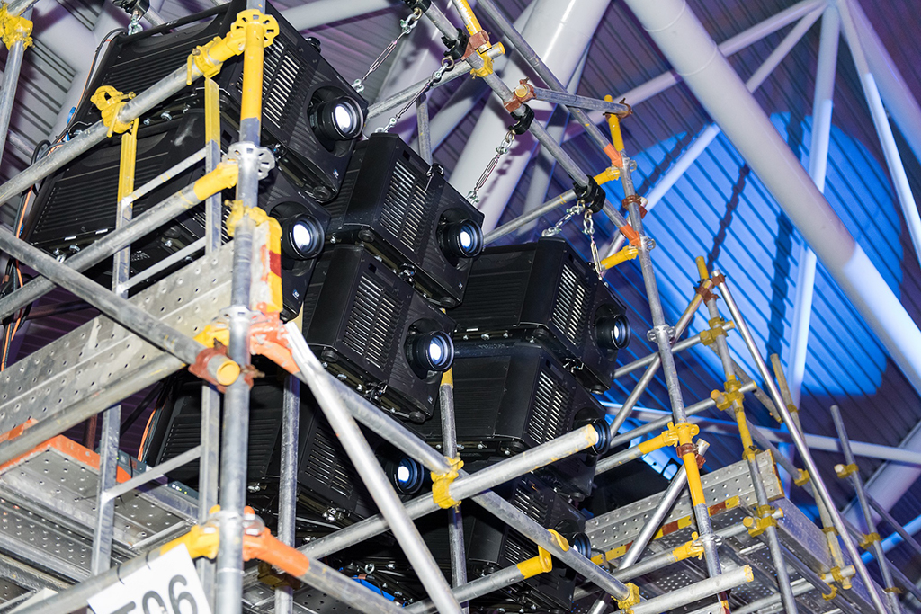 Los proyectores fueron suspendidos de unas torres construidas ex profeso para la ocasión y que superaban la parte más elevada del graderío; mientras que por encima de la grada se ubicaron dos salas de control, una a cada lado del estadio, en las que se localizaron los servidores Pandoras Box Media y otros elementos utilizados para proveer de contenido a los proyectores.