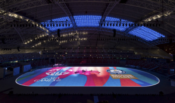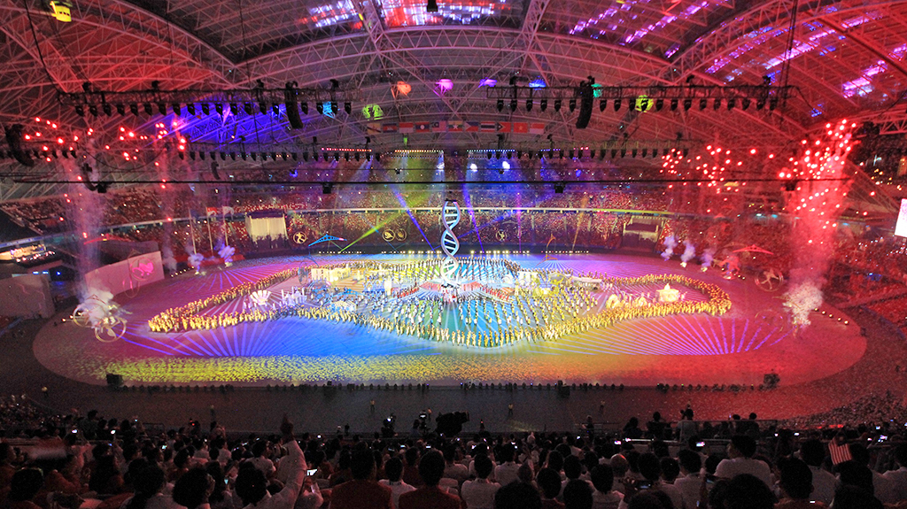 “Es la primera vez que presentamos un espectáculo de videomapping de esta magnitud, y lo hacemos en un acontecimiento deportivo muy esperado y usando el suelo del Estadio Nacional como pantalla. Se trata del mayor despliegue de proyectores Christie empleados en un solo acontecimiento. Nos ha llevado un mes completar el proceso de instalación”, comenta Adrian Goh, director general de Hexogon Solution.