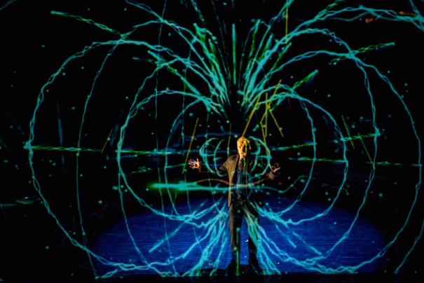 Diseñada por el especialista 59 作品, ‘Light Falls’ combinó los efectos holográficos y de animación de tridimensionales Holo-Gauze con representaciones dramáticas del recorrido de Einstein hasta la concepción de su teoría.
