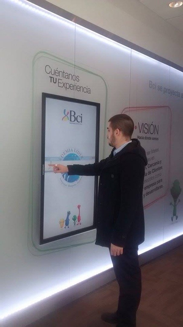 Con el propósito de optimizar el funcionamiento de la Academia BCI y generar cierta interacción con sus colaboradores y aprendices, Wavetec instaló dos pantallas touch capacitivas de 55 pulgadas dispuestas verticalmente para recibir feedbacks de manera fácil y directa de quienes pasan por la Academia BCI. Los colaboradores pueden dejar reflejada en cada pantalla de forma digital sus comentarios y opiniones de la experiencia de training vivida.