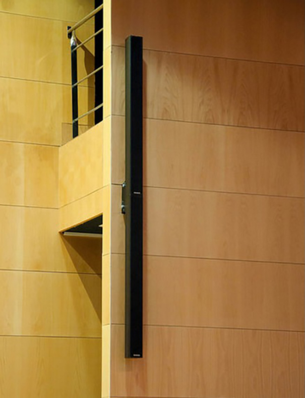 Para el salón de actos del centro CEU San Pablo en Sevilla se instalaron un total de 4 unidades de esta columna: 2 a la izquierda del escenario y 2 a la derecha. El objetivo era garantizar la cobertura total de la sala. Las columnas contaban para su instalación con un soporte de pared, específicamente diseñado para ella, que permite su inclinación para dirigirla hacia el punto deseado.