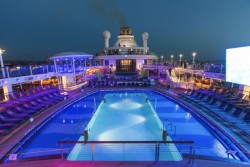 Diferentes zonas al aire libre en la cubierta de este crucero cuentan con una espectacular iluminación arquitectónica gracias a Elar 108 Par RGBW de Elation Professional, tales como la piscina al aire libre y las cubiertas para actividades deportivas y de tripulación.