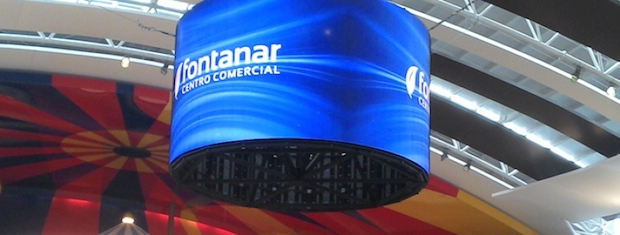 Otro de los proyectos de Kolo desarrollados con el software de digital signage Deneva ha sido en el centro comercial Fontanar, ubicado en la localidad colombiana de Chía (al Norte de Bogotá), en la instalación de una pantalla Led circular hecha a medida (在上图中), 直径为 6,3 metros y un peso de 1.680 公斤。, que está suspendida a más de 14 米高.