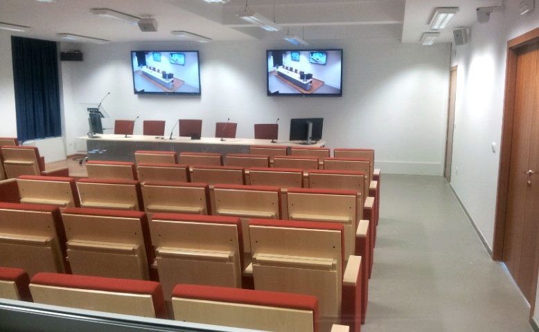Para la presentación de contenidos se instalado un proyector HD de ultracorta distancia, con una superficie de proyección superior a las 100 pulgadas y como refuerzo de la señal de vídeo en sala se han instalado monitores Led Full HD de gran formato y pantallas encastradas en la mesa de presidencia.