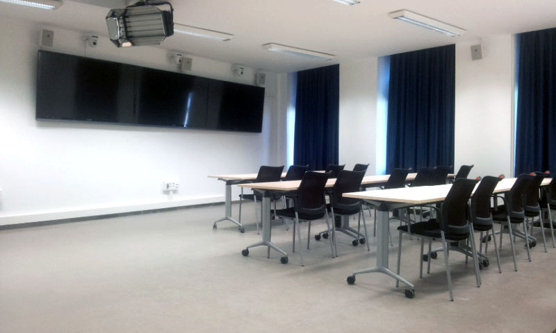 Esta aula cuenta también con un sistema de sonorización de alta calidad, microfonía profesional y un sistema de videoconferencia HD con capacidad de comunicación multipunto.
