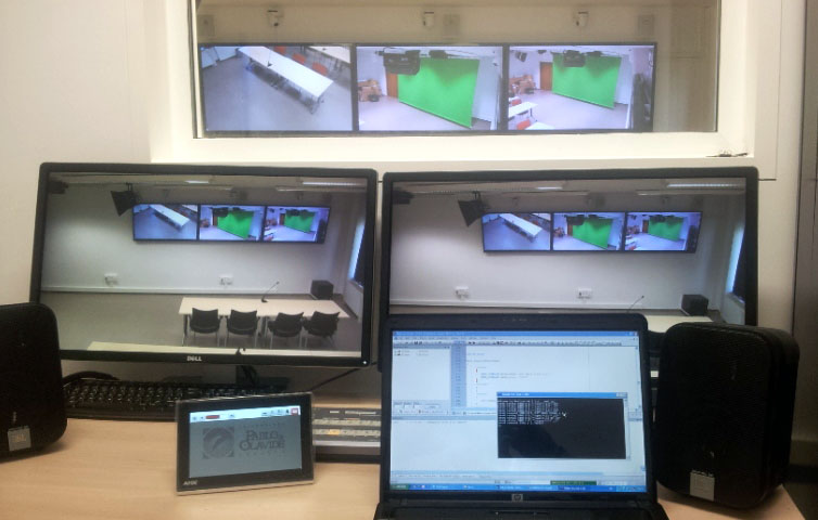 La grabación de eventos se realiza mediante cámaras Full HD robotizadas y un sistema de grabación digital de vídeo con capacidad para realizar streaming del vídeo en sala. El aula cuenta, asimismo con un sistema de control centralizado para gestionar todos los equipos desde un sencillo interfaz, implementado sobre un dispositivo táctil.