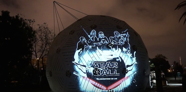 晚上, la falla se transforma en un espectáculo de proyección holográfica, con referencias a los personajes de ‘Star Wars’, y efectos de luz y sonido, creado por la catedrática de escultura y profesora de la Facultad de Bellas Artes de la UPV, Amparo Carbonell, y el grupo de investigación Laboratorio de Luz de dicha facultad.