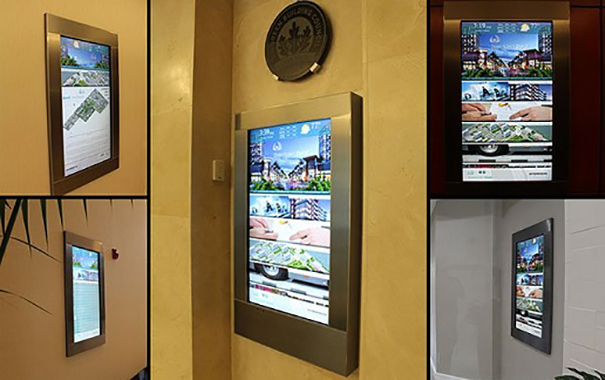 Localizados en los vestíbulos de los cinco edificios de oficinas, estos kioscos muestran información que es actualizada por Gibson Realty Group a través del Content Management System que incorporan.