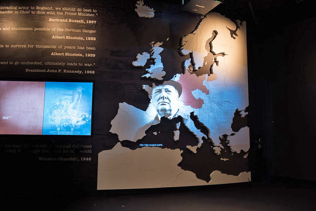 El elemento clave de esta exposición es un mapa en relieve gigante de Europa que se extiende una pared curva y que se acompaña de monitores táctiles. “Un proyector de ultra-corto alcance 松下 PT-DZ870LK hace que el mapa cobre vida con imágenes que muestran la progresión de la guerra y que pone de relieve cómo los territorios y las fronteras se transformaron cuando la Segunda Guerra Mundial se puso en marcha y los ejércitos comenzaron a avanzar”, explica Steve Calver, director del proyecto de Electrosonic.