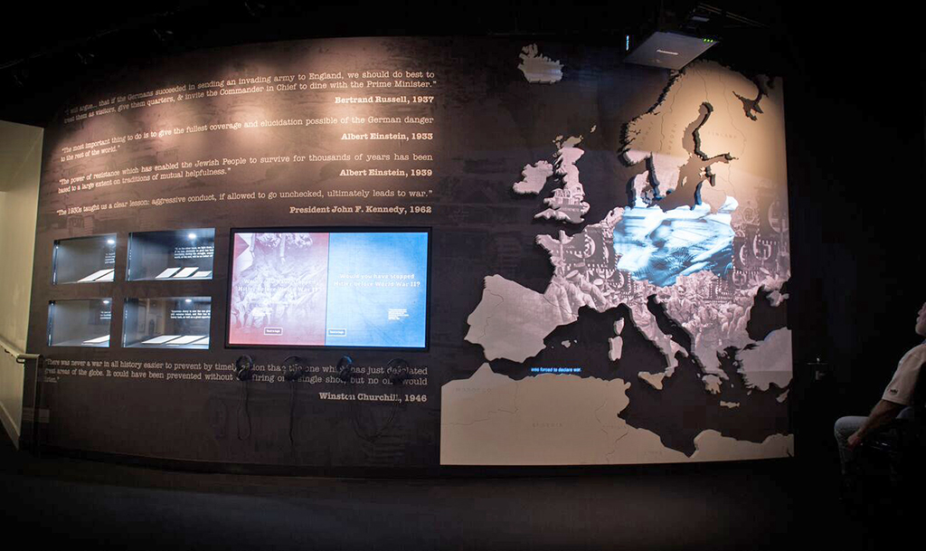 The Appeasement es la última exhibición permanente de este centro cultural de Los Ángeles que tiene como elemento protagonista gran mapa interactivo que muestra el avance de las tropas durante la II Guerra Mundial. Una instalación sustentada por un proyector Panasonic PT-DZ870LK y que se acompaña de una pantalla de 70 pulgadas de Planar y monitores NEC de 21.