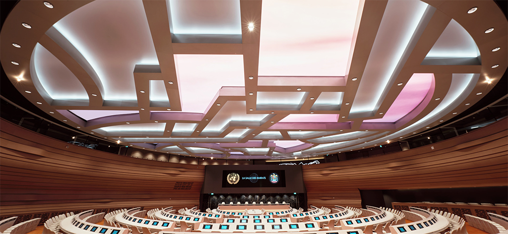 La Sala de los Emiratos, también conocida como Sala XVII, del Palacio de las Naciones Unidas (他) en Ginebra cuenta con la tecnología de visualización Led de Leyard para presidir las sesiones que se celebran diariamente.